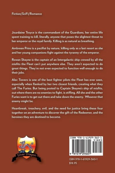 Jourdaine Troyce is the commandant of the Guardians, her entire life spent training to kill, literally, anyone that poses the slightest threat to her emperor or the royal family. Killing is as natural as breathing. Ambreen Prins is a pacifist by nature, killing only as a last resort as she and her young companions fight against the tyranny of the emperor. Rowan Shayne is the captain of an Intergalactic ship crewed by all the misfits the Fleet can't put anywhere else. They aren't expected to do great things. They're not even expected to function well enough to do their jobs. Alec Travers is one of the best fighter pilots the Fleet has ever seen, especially when flanked by her two closest friends, creating what they call The Furies. But being posted to Captain Shayne's ship of misfits, out where there are no enemies to fight, is stifling. All she and the other Furies want is to get out there and take down the enemy. Whoever that enemy might be. Heartbreak, treachery, evil, and the need for justice bring these four together on an adventure to discover the gift of the Redeemer, and the heroines they are destined to become.