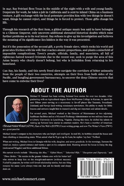 In 1947, Ray Petriani flees Texas in the middle of the night with a wife and young family. Desperate for work, he takes a job in California and is sent to inland China on a business venture. A gift exchange with the local potentate gives him two things he doesn't want, things he cannot reject, and things he is forced to protect. Those gifts transform his life. His research of the first item, a gilded antique music box said to have belonged to a Chinese Emperor, only uncovers additional shrouded historical doubts which raise further problems as to its real intent. Ray refuses to give up his investigation and believes the meaning of its significance lies hidden in the way it was presented. But it's the possession of the second gift, a pretty female slave, which rocks his world and generates friction with his wife that reaches atomic proportions and plants a minefield of impossible complications. Town people, officials, family, and associates, all full of righteous hatred toward Orientals due to the recent war, seek to purge the area of this Asian beauty who clearly doesn't belong, but who is forbidden from returning to her homeland. Can Ray, his family, and this newly freed slave navigate the corridors of bitter hatred from the people of their two countries, attempts on their lives from both sides of the Pacific, and bungling government bureaucracy, to uncover the deep Chinese secrets that have come to entwine their lives?