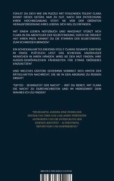 Clara dachte, sie hätte endlich ihren Platz in der Welt gefunden - eine Stiftung für hochbegabte Kinder aus schwierigen Verhältnissen, ein Ort der Hoffnung, ihrer Vision entsprungen. Doch die große Verantwortung, die sie trägt, bringt sie immer wieder an ihre Grenzen. Während die Erwartungen der Förderer und die eigenen Zweifel wachsen, merkt Clara, wie sie droht, sich selbst zu verlieren. Auch ihre Beziehung zu Flo gerät ins Wanken. Clara wird von alten Ängsten eingeholt: Wird sie jemals gut genug sein - für sich selbst, für ihn? Oder bleibt sie gefangen in einem ständigen Kompromiss, um dazuzugehören? Doch ein unerwartetes Zusammentreffen mit einem jungen Mädchen weckt in Clara etwas Neues. Vielleicht ist es an der Zeit, ihre eigenen Schranken zu durchbrechen, die Dunkelheit der Nacht zu erhellen und endlich den Mut zu finden, das Leben zu leben, das sie sich tief im Inneren erträumt hat. Gifted - Sehnsucht der Nacht ist der zweite Teil einer bewegende Geschichten über Träume, Zweifel und den Mut, der eigenen Sehnsucht zu folgen. Für alle, die anders sind - und die wissen, dass der Weg zur Freiheit oft mit den Schatten der eigenen Nacht beginnt.