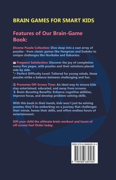 gifts for 12 year old boy Brain-Teasers & Challenges: The Ultimate Off-Screen Adventure for Kids 8-12! Are you on the hunt for the perfect activity book that keeps young minds engaged and away from screens? Dive into this hand-crafted collection of brain-teasers, designed especially for kids aged 8-12, and watch them embark on an intellectual adventure unlike any other! Features of Our Brain-Teaser Book:Diverse Puzzle Collection: Dive deep into a vast array of puzzles - from classic games like Hangman and Sudoku to unique challenges like Nurikabe and Kakurasu. Frequent Satisfaction: Discover the joy of completion every five pages, with puzzles and their solutions placed side by side. Perfect Difficulty Level: Tailored for young minds, these puzzles strike a balance between challenging and fun. Promotes Off-Screen Time: An ideal way to ensure kids stay entertained, educated, and away from screens. Brain-Boosting Benefits: Enhance cognitive abilities, improve focus, and develop problem-solving skills. Great Stocking Stuffers For Kids Good With this book in their hands, kids won't just be solving puzzles; they'll be embarking on a journey that challenges their minds, hones their skills, and offers endless hours of entertainment. Gift your child the ultimate brain workout and hours of off-screen fun! Order today.