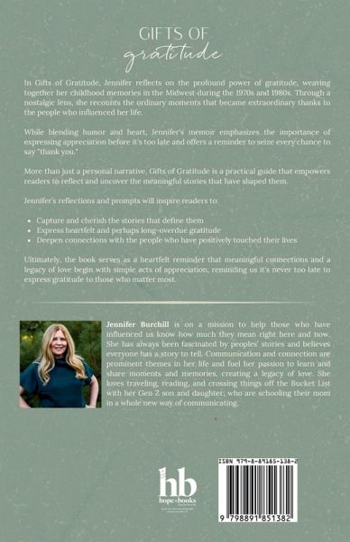 In Gifts of Gratitude, Jennifer reflects on the profound power of gratitude, weaving together her childhood memories in the Midwest during the 1970s and 1980s. Through a nostalgic lens, she recounts the ordinary moments that became extraordinary thanks to the people who influenced her life. While blending humor and heart, Jennifer's memoir emphasizes the importance of expressing appreciation before it's too late and offers a reminder to seize every chance to say "thank you." More than just a personal narrative, Gifts of Gratitude is a practical guide that empowers readers to reflect and uncover the meaningful stories that have shaped them. Jennifer's reflections and prompts will inspire readers to: Capture and cherish the stories that define them Express heartfelt and perhaps long-overdue gratitude Deepen connections with the people who have positively touched their lives Ultimately, the book serves as a heartfelt reminder that meaningful connections and a legacy of love begin with simple acts of appreciation, reminding us it's never too late to express gratitude to those who matter most.