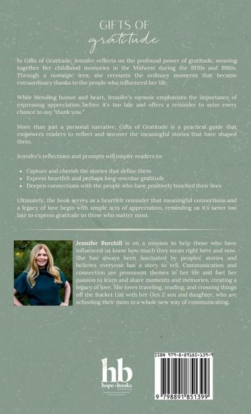 In Gifts of Gratitude, Jennifer reflects on the profound power of gratitude, weaving together her childhood memories in the Midwest during the 1970s and 1980s. Through a nostalgic lens, she recounts the ordinary moments that became extraordinary thanks to the people who influenced her life. While blending humor and heart, Jennifer's memoir emphasizes the importance of expressing appreciation before it's too late and offers a reminder to seize every chance to say "thank you." More than just a personal narrative, Gifts of Gratitude is a practical guide that empowers readers to reflect and uncover the meaningful stories that have shaped them. Jennifer's reflections and prompts will inspire readers to: Capture and cherish the stories that define them Express heartfelt and perhaps long-overdue gratitude Deepen connections with the people who have positively touched their lives Ultimately, the book serves as a heartfelt reminder that meaningful connections and a legacy of love begin with simple acts of appreciation, reminding us it's never too late to express gratitude to those who matter most.