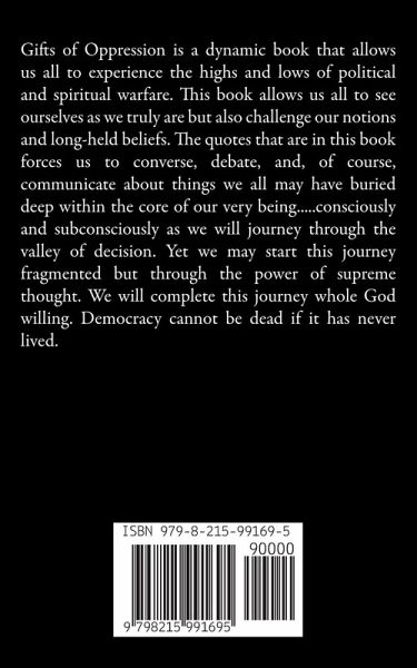 Gifts of Oppression is a dynamic book that allows us all to experience the highs and lows of political and spiritual warfare. This book allows us all to see ourselves as we truly are but also challenge our notions and long-held beliefs. The quotes that are in this book forces us to converse, debate, and, of course, communicate about things we all may have buried deep within the core of our very being.....consciously and subconsciously as we will journey through the valley of decision. Yet we may start this journey fragmented but through the power of supreme thought. We will complete this journey whole God willing. Democracy cannot be dead if it has never lived.