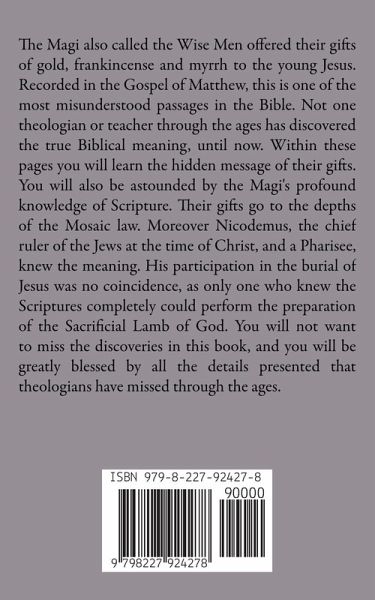 The Magi also called the Wise Men offered their gifts of gold, frankincense and myrrh to the young Jesus. Recorded in the Gospel of Matthew, this is one of the most misunderstood passages in the Bible. Not one theologian or teacher through the ages has discovered the true Biblical meaning, until now. Within these pages you will learn the hidden message of their gifts. You will also be astounded by the Magi's profound knowledge of Scripture. Their gifts go to the depths of the Mosaic law. Moreover Nicodemus, the chief ruler of the Jews at the time of Christ, and a Pharisee, knew the meaning. His participation in the burial of Jesus was no coincidence, as only one who knew the Scriptures completely could perform the preparation of the Sacrificial Lamb of God. You will not want to miss the discoveries in this book, and you will be greatly blessed by all the details presented that theologians have missed through the ages.