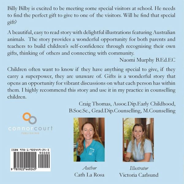 Billy Bilby is excited to be meeting some special visitors at school. He needs to find the perfect gift to give to one of the visitors. Will he find that special gift? "God's gifts of grace come in many forms. Each of you has received a gift in order to serve others. You should use it faithfully." (1 Peter 4:10) A beautiful, easy to read story with delightful illustrations featuring Australian animals. The story provides a wonderful opportunity for both parents and teachers to build children's self-confidence through recognising their own gifts, thinking of others and connecting with community. Naomi Murphy B.Ed.EC Children often want to know if they have anything special to give, if they carry a superpower, they are unaware of. Gifts is a wonderful story that opens an opportunity for vibrant discussions on what each person has within them. I highly recommend this story and use it in my practice in counselling children. Craig Thomas, Assoc.Dip.Early Childhood, B.Soc.Sc., Grad.Dip.Counselling, M.Counselling