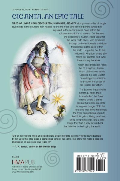 TIRED OF LIVING NEAR DISCOURTEOUS HUMANS, GIGANTA stomps over miles of rough lava fields in the coursing rain hoping to find the trolls who left her behind when they migrated to the secret places deep within the volcanic mountains of Iceland. On the way she encounters, Gustaf, Head Scout for the Inner Earth Elves, who leads her through darkened tunnels and down treacherous paths deep within the earth. He guides her to the hidden Elf Kingdom where she meets Ilg, another troll, who lives among the elves. When an earthquake rocks the Elf Kingdom, Queen Drotti of the Elves sends Giganta, Ilg, and Gustaf on a dangerous mission to discover the cause of the terrible disruption. The journey, fraught with hardship, takes them to Musterihof, the Great Temple, where Giganta learns that all life on earth is in grave danger. With the land and their lives threatened, the three companions return to the Elf Kingdom. Using newfound skills, a cunning plan, and a little magic they find a way to turn back the tide that is destroying the earth.
