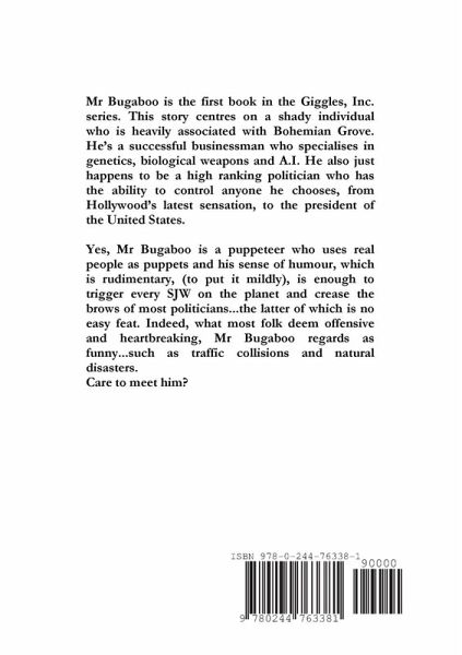 Mr Bugaboo is the first book in the Giggles, Inc. series. This story centres on a shady individual who is heavily associated with Bohemian Grove. He's a successful businessman who specialises in genetics, biological weapons and A.I. He also just happens to be a high ranking politician who has the ability to control anyone he chooses, from Hollywood's latest sensation, to the president of the United States. Yes, Mr Bugaboo is a puppeteer who uses real people as puppets and his sense of humour, which is rudimentary, (to put it mildly), is enough to trigger every SJW on the planet and crease the brows of most politicians...the latter of which is no easy feat. Indeed, what most folk deem offensive and heartbreaking, Mr Bugaboo regards as funny...such as traffic collisions and natural disasters. Care to meet him?