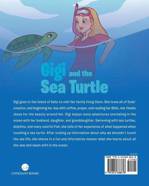 Gigi goes to the island of Oahu to visit her family living there. She loves all of Gods' creation, and beginning her day with coffee, prayer, and reading her Bible, she thanks Jesus for the beauty around her. Gigi enjoys many adventures snorkeling in the ocean with her husband, daughter, and granddaughter. Swimming with sea turtles, dolphins, and many colorful fish, she tells of her experience of what happened when touching a sea turtle. After looking up information about why we shouldn't touch the sea life, she shares in a fun and informative manner what she learns about all she saw and swam with in the ocean.