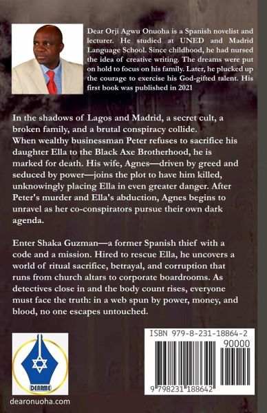 In the shadows of Lagos and Madrid, a secret cult, a broken family, and a brutal conspiracy collide. When wealthy businessman Peter refuses to sacrifice his daughter Ella to the Black Axe Brotherhood, he is marked for death. His wife, Agnes-driven by greed and seduced by power-joins the plot to have him killed, unknowingly placing Ella in even greater danger. After Peter's murder and Ella's abduction, Agnes begins to unravel as her co-conspirators pursue their own dark agenda. Enter Shaka Guzman-a former Spanish thief with a code and a mission. Hired to rescue Ella, he uncovers a world of ritual sacrifice, betrayal, and corruption that runs from church altars to corporate boardrooms. As detectives close in and the body count rises, everyone must face the truth: in a web spun by power, money, and blood, no one escapes untouched.