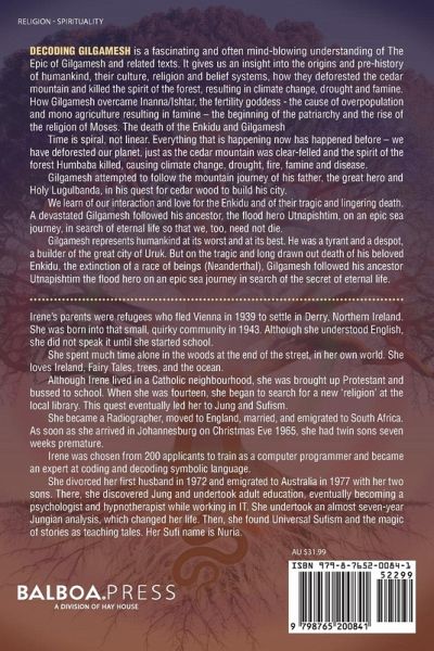 Decoding Gilgamesh is a fascinating and often mind-blowing understanding of The Epic of Gilgamesh and related texts. It gives us an insight into the origins and pre-history of humankind, their culture, religion and belief systems, how they deforested the cedar mountain and killed the spirit of the forest, resulting in climate change, drought and famine. How Gilgamesh overcame Inanna/Ishtar, the fertility goddess - the cause of overpopulation and mono agriculture resulting in famine - the beginning of the patriarchy and the rise of the religion of Moses. The death of the Enkidu and Gilgamesh Time is spiral, not linear. Everything that is happening now has happened before - we have deforested our planet, just as the cedar mountain was clear-felled and the spirit of the forest Humbaba killed, causing climate change, drought, fire, famine and disease. Gilgamesh attempted to follow the mountain journey of his father, the great hero and Holy Lugulbanda, in his quest for cedar wood to build his city. We learn of our interaction and love for the Enkidu and of their tragic and lingering death. A devastated Gilgamesh followed his ancestor, the flood hero Utnapishtim, on an epic sea journey, in search of eternal life so that we, too, need not die. Gilgamesh represents humankind at its worst and at its best. He was a tyrant and a despot, a builder of the great city of Uruk. But on the tragic and long drawn out death of his beloved Enkidu, the extinction of a race of beings (Neanderthal), Gilgamesh followed his ancestor Utnapishtim the flood hero on an epic sea journey in search of the secret of eternal life.