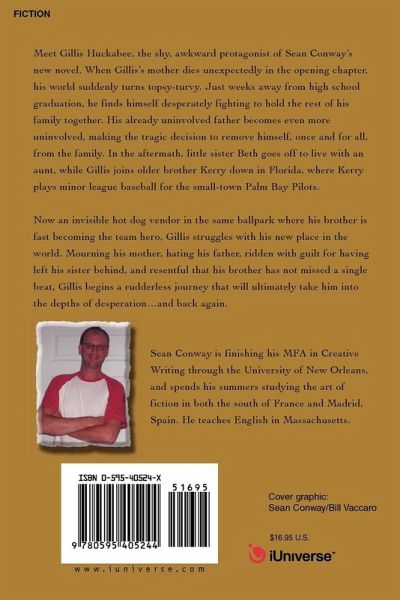 Meet Gillis Huckabee, the shy, awkward protagonist of Sean Conway's new novel. When Gillis's mother dies unexpectedly in the opening chapter, his world suddenly turns topsy-turvy. Just weeks away from high school graduation, he finds himself desperately fighting to hold the rest of his family together. His already uninvolved father becomes even more uninvolved, making the tragic decision to remove himself, once and for all, from the family. In the aftermath, little sister Beth goes off to live with an aunt, while Gillis joins older brother Kerry down in Florida, where Kerry plays minor league baseball for the small-town Palm Bay Pilots. Now an invisible hot dog vendor in the same ballpark where his brother is fast becoming the team hero, Gillis struggles with his new place in the world. Mourning his mother, hating his father, ridden with guilt for having left his sister behind, and resentful that his brother has not missed a single beat, Gillis begins a rudderless journey that will ultimately take him into the depths of desperation.and back again.