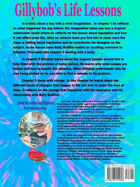 Gillybob's Life Lessons is a story about a boy with a vivid imagination. In chapter 1 he reflects on what happened the day before. His imagination takes you into a tropical underwater world where he reflects on the lesson about reputation and how it can affect ones life. After he reflects back you find him in class were the class is talking about reputation and he contributes his thoughts on the subject. As he leaves class Bully Bullfish makes an insulting comment to Gillybob. This leads into chapter 2 dealing with a bully. In chapter 2 Gillybob learns about the support system around him to help them with the problem of being bullied. He learns why some people are bullied and how to handle the situation. When Gillybob understands why he was being picked on he was able to find a remedy to his problem . Chapter 3 deals with change. In this chapter he learns about the different kinds of changes that happen in life and how to make the best of them. It reflects on the change that happened with his reputation and his relationship with Bully Bullfish.