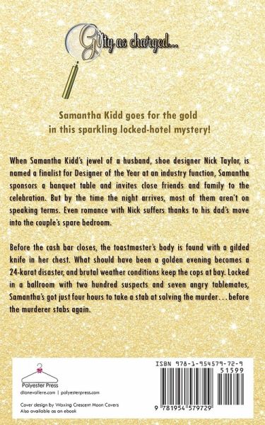 All that glitters isn't gold in Samantha Kidd's latest mystery... When Samantha Kidd's jewel of a husband, shoe designer Nick Taylor, is named a finalist for Designer of the Year at an industry function, Samantha sponsors a banquet table and invites close friends and family to the celebration. But by the time the night arrives, most of them aren't on speaking terms. Even romance with Nick suffers thanks to his dad's move into the couple's spare bedroom. ¿ Before the cash bar closes, the toastmaster's body is found with a gilded knife in her chest. What should have been a golden evening becomes a 24-karat disaster, and brutal weather conditions keep the cops at bay. Locked in a ballroom with two hundred suspects and seven angry tablemates, Samantha's got just four hours to take a stab at solving the murder...before the murderer stabs again.