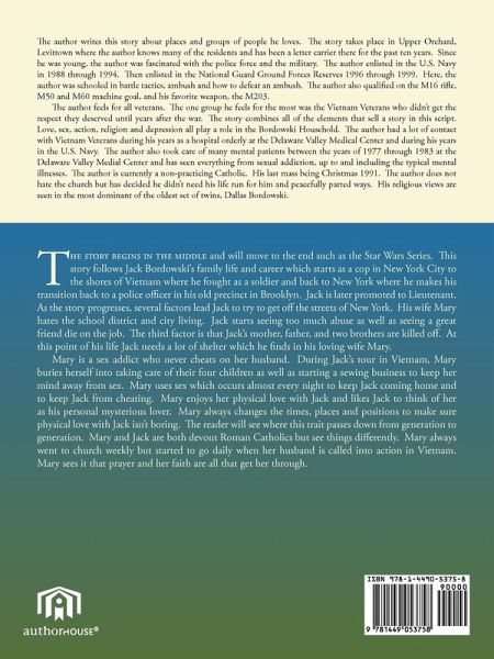 The story begins in the middle and will move to the end such as the Star Wars Series. This story follows Jack Bordowski's family life and career which starts as a cop in New York City to the shores of Vietnam where he fought as a soldier and back to New York where he makes his transition back to a police officer in his old precinct in Brooklyn. Jack is later promoted to Lieutenant. As the story progresses, several factors lead Jack to try to get off the streets of New York. His wife Mary hates the school district and city living. Jack starts seeing too much abuse as well as seeing a great friend die on the job. The third factor is that Jack's mother, father, and two brothers are killed off. At this point of his life Jack needs a lot of shelter which he finds in his loving wife Mary. Mary is a sex addict who never cheats on her husband. During Jack's tour in Vietnam, Mary buries herself into taking care of their four children as well as starting a sewing business to keep her mind away from sex. Mary uses sex which occurs almost every night to keep Jack coming home and to keep Jack from cheating. Mary enjoys her physical love with Jack and likes Jack to think of her as his personal mysterious lover. Mary always changes the times, places and positions to make sure physical love with Jack isn't boring. The reader will see where this trait passes down from generation to generation. Mary and Jack are both devout Roman Catholics but see things differently. After Jack is called into action in Vietnam, Mary sees prayer and faith as all that pulled her through. Jack knows prayer alone doesn't work.
