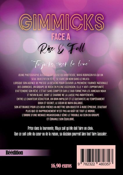 Jeune photographe aussi talentueuse qu'ambitieuse, Maya Robinson n'a qu'un seul objectif en tête: se faire un nom dans le milieu.Lorsque son agence de presse la désigne pour couvrir la première tournée nationale des GIMMICKS, un groupe de rock en pleine ascension, elle y voit l'opportunité d'atteindre son rêve.C'était sans compter sur le duo formé par les jumeaux Noah et Nevin Blake, dont le charme ne la laisse pas indifférente.Entre le chanteur séducteur, un brin impulsif et le guitariste au tempérament doux et secret, le coeur de Maya balance.Son attirance pour les deux frères va mettre son objectif à rude épreuve. D'autant plus que ce rapprochement n'est pas au goût de tout le monde.L'ombre d'une menace insaisissable sème le trouble au sein du groupe et ébranle son équilibre.Prise dans la tourmente, Maya sait qu'elle doit faire un choix. Que ce soit celle du coeur ou de la raison, sa décision pourrait bien tout faire basculer.* Réédition*
