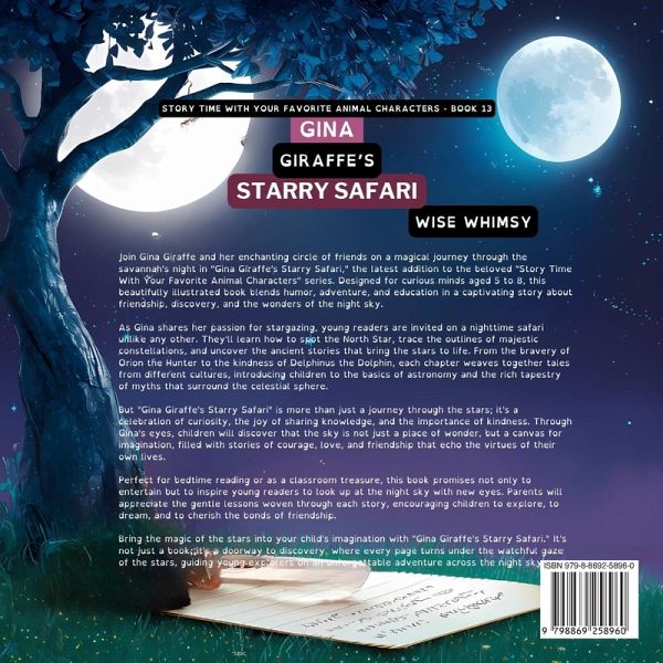 Join Gina Giraffe and her enchanting circle of friends on a magical journey through the savannah's night in "Gina Giraffe's Starry Safari," the latest addition to the beloved "Story Time With Your Favorite Animal Characters" series. Designed for curious minds aged 5 to 8, this beautifully illustrated book blends humor, adventure, and education in a captivating story about friendship, discovery, and the wonders of the night sky. As Gina shares her passion for stargazing, young readers are invited on a nighttime safari unlike any other. They'll learn how to spot the North Star, trace the outlines of majestic constellations, and uncover the ancient stories that bring the stars to life. From the bravery of Orion the Hunter to the kindness of Delphinus the Dolphin, each chapter weaves together tales from different cultures, introducing children to the basics of astronomy and the rich tapestry of myths that surround the celestial sphere. But "Gina Giraffe's Starry Safari" is more than just a journey through the stars; it's a celebration of curiosity, the joy of sharing knowledge, and the importance of kindness. Through Gina's eyes, children will discover that the sky is not just a place of wonder, but a canvas for imagination, filled with stories of courage, love, and friendship that echo the virtues of their own lives. Perfect for bedtime reading or as a classroom treasure, this book promises not only to entertain but to inspire young readers to look up at the night sky with new eyes. Parents will appreciate the gentle lessons woven through each story, encouraging children to explore, to dream, and to cherish the bonds of friendship. Bring the magic of the stars into your child's imagination with "Gina Giraffe's Starry Safari." It's not just a book; it's a doorway to discovery, where every page turns under the watchful gaze of the stars, guiding young explorers on an unforgettable adventure across the night sky.