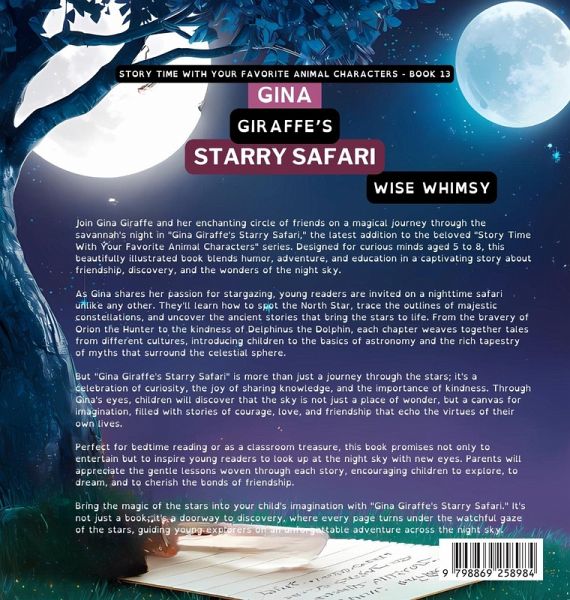 Join Gina Giraffe and her enchanting circle of friends on a magical journey through the savannah's night in "Gina Giraffe's Starry Safari," the latest addition to the beloved "Story Time With Your Favorite Animal Characters" series. Designed for curious minds aged 5 to 8, this beautifully illustrated book blends humor, adventure, and education in a captivating story about friendship, discovery, and the wonders of the night sky. As Gina shares her passion for stargazing, young readers are invited on a nighttime safari unlike any other. They'll learn how to spot the North Star, trace the outlines of majestic constellations, and uncover the ancient stories that bring the stars to life. From the bravery of Orion the Hunter to the kindness of Delphinus the Dolphin, each chapter weaves together tales from different cultures, introducing children to the basics of astronomy and the rich tapestry of myths that surround the celestial sphere. But "Gina Giraffe's Starry Safari" is more than just a journey through the stars; it's a celebration of curiosity, the joy of sharing knowledge, and the importance of kindness. Through Gina's eyes, children will discover that the sky is not just a place of wonder, but a canvas for imagination, filled with stories of courage, love, and friendship that echo the virtues of their own lives. Perfect for bedtime reading or as a classroom treasure, this book promises not only to entertain but to inspire young readers to look up at the night sky with new eyes. Parents will appreciate the gentle lessons woven through each story, encouraging children to explore, to dream, and to cherish the bonds of friendship. Bring the magic of the stars into your child's imagination with "Gina Giraffe's Starry Safari." It's not just a book; it's a doorway to discovery, where every page turns under the watchful gaze of the stars, guiding young explorers on an unforgettable adventure across the night sky.
