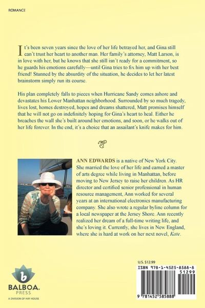 It's been seven years since the love of her life betrayed her, and Gina still can't trust her heart to another man. Her family's attorney, Matt Larson, is in love with her, but he knows that she still isn't ready for a commitment, so he guards his emotions carefully-until Gina tries to fix him up with her best friend! Stunned by the absurdity of the situation, he decides to let her latest brainstorm simply run its course. His plan completely falls to pieces when Hurricane Sandy comes ashore and devastates his Lower Manhattan neighborhood. Surrounded by so much tragedy, lives lost, homes destroyed, hopes and dreams shattered, Matt promises himself that he will not go on indefinitely hoping for Gina's heart to heal. Either he breaches the wall she's built around her emotions, and soon, or he walks out of her life forever. In the end, it's a choice that an assailant's knife makes for him.