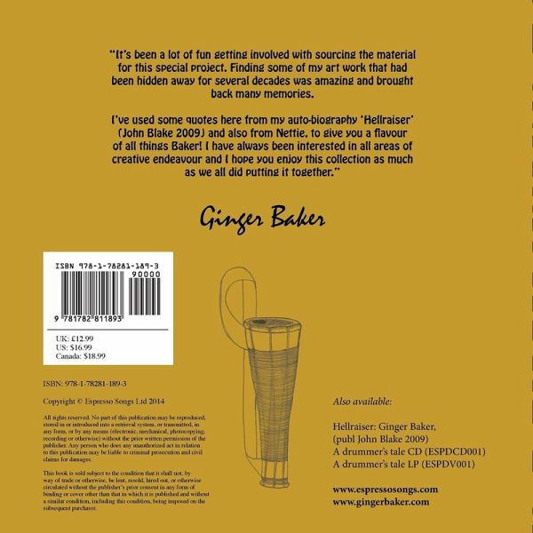 "It's been a lot of fun getting involved with sourcing the material for this special project. Finding some of my art work that had been hidden away for several decades was amazing and brought back many memories. I've used some quotes here from my auto-biography 'Hellraiser' (John Blake 2009) and also from Nettie, to give you a flavour of all things Baker! I have always been interested in all areas of creative endeavour and I hope you enjoy this collection as much as we all did putting it together." Ginger Baker