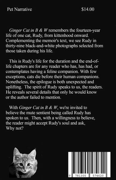 GINGER CAT IN B & W remembers the fourteen-year life of one cat, Rudy, from kittenhood onward. Complementing the memoir's text, we see Rudy in thirty-nine black-and-white photographs selected from those taken during his life. This is Rudy's life for the duration and the end-of-life chapters are for any reader who has, has had, or contemplates having a feline companion. With few exceptions, cats die before their human companions. Nonetheless, the epilogue is both unexpected and uplifting. The spirit of Rudy speaks to the us, the readers. He reveals several details that only he would know or the author failed to mention. With GINGER CAT IN B & W, we're invited to believe the mute sentient being called Rudy has spoken to us. Then, with a willingness to believe, the reader might accept Rudy's soul and ask, Why not?