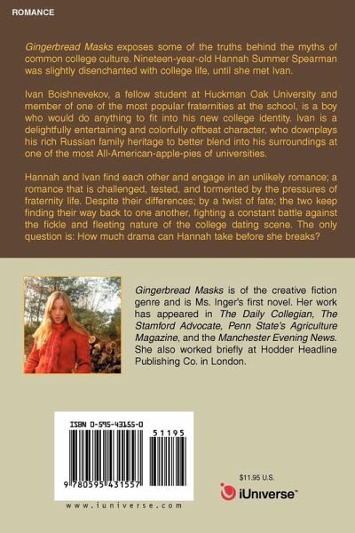 Gingerbread Masks exposes some of the truths behind the myths of common college culture. Nineteen-year-old Hannah Summer Spearman was slightly disenchanted with college life, until she met Ivan. Ivan Boishnevekov, a fellow student at Huckman Oak University and member of one of the most popular fraternities at the school, is a boy who would do anything to fit into his new college identity. Ivan is a delightfully entertaining and colorfully offbeat character, who downplays his rich Russian family heritage to better blend into his surroundings at one of the most All-American-apple-pies of universities. Hannah and Ivan find each other and engage in an unlikely romance; a romance that is challenged, tested, and tormented by the pressures of fraternity life. Despite their differences; by a twist of fate; the two keep finding their way back to one another, fighting a constant battle against the fickle and fleeting nature of the college dating scene. The only question is: How much drama can Hannah take before she breaks?