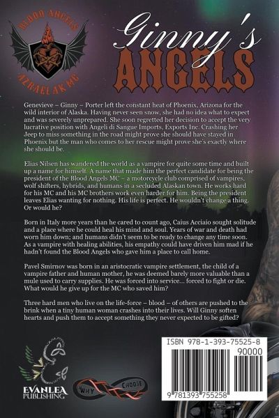 **Paranormal MC Reverse Harem Romance** _____ Genevieve – Ginny – Porter left the constant heat of Phoenix, Arizona for the wild interior of Alaska. Having never seen snow, she had no idea what to expect and was severely unprepared. She soon regretted her decision to accept the very lucrative position with Angeli di Sangue Imports, Exports Inc. Crashing her Jeep to miss something in the road might prove she should have stayed in Phoenix but the man who comes to her rescue might prove she's exactly where she should be. Elias Nilsen has wandered the world as a vampire for quite some time and built up a name for himself. A name that made him the perfect candidate for being the president of the Blood Angels MC – a motorcycle club comprised of vampires, wolf shifters, hybrids, and humans in a secluded Alaskan town. He works hard for his MC and his MC brothers work even harder for him. Being the president leaves Elias wanting for nothing. His life is perfect. He wouldn't change a thing. Or would he? Born in Italy more years than he cared to count ago, Caius Acciaio sought solitude and a place where he could heal his mind and soul. Years of war and death had worn him down; and humans didn't seem to be ready to change any time soon. As a vampire with healing abilities, his empathy could have driven him mad if he hadn't found the Blood Angels who gave him a place to call home. Pavel Smirnov was born in an aristocratic vampire settlement, the child of a vampire father and human mother, he was deemed barely more valuable than a mule used to carry supplies. He was forced into service… forced to fight or die. What would he give up for the MC who saved him? Three hard men who live on the life-force – blood – of others are pushed to the brink when a tiny human woman crashes into their lives. Will Ginny soften hearts and push them to accept something they never expected to be gifted?