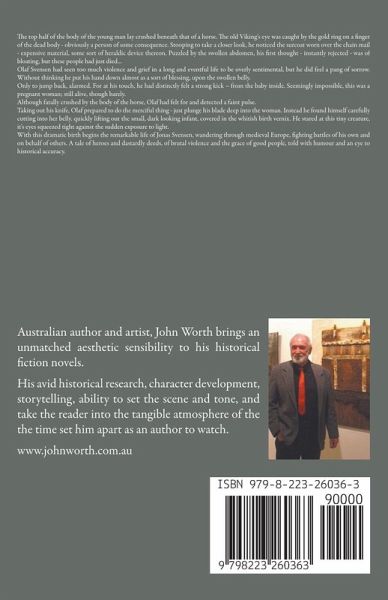 The top half of the body of the young man lay crushed beneath that of a horse. The old Viking's eye was caught by the gold ring on a finger of the dead body - obviously a person of some consequence. Stooping to take a closer look, he noticed the surcoat worn over the chain mail - expensive material, some sort of heraldic device thereon. Puzzled by the swollen abdomen, his first thought - instantly rejected - was of bloating, but these people had just died... Olaf Svensen had seen too much violence and grief in a long and eventful life to be overly sentimental, but he did feel a pang of sorrow. Without thinking he put his hand down almost as a sort of blessing, upon the swollen belly. Only to jump back, alarmed. For at his touch, he had distinctly felt a strong kick - from the baby inside. Seemingly impossible, this was a pregnant woman; still alive, though barely. Although fatally crushed by the body of the horse, Olaf had felt for and detected a faint pulse. Taking out his knife, Olaf prepared to do the merciful thing - just plunge his blade deep into the woman. Instead he found himself carefully cutting into her belly. quickly lifting out the small, dark looking infant, covered in the whitish birth vernix. He stared at this tiny creature, it's eyes squeezed tight against the sudden exposure to light. With this dramatic birth begins the remarkable life of Jonas Svensen, wandering through medieval Europe, fighting battles of his own and on behalf of others. A tale of heroes and dastardly deeds, of brutal violence and the grace of good people, told with humour and an eye to historical accuracy.