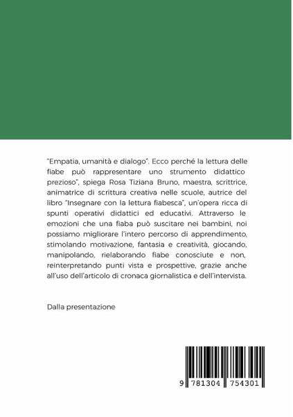 "Empatia, umanità e dialogo". Ecco perché la lettura delle fiabe può rappresentare uno strumento didattico prezioso", spiega Rosa Tiziana Bruno, maestra, scrittrice, animatrice di scrittura creativa nelle scuole, autrice del libro "Insegnare con la lettura fiabesca", un'opera ricca di spunti operativi didattici ed educativi. Attraverso le emozioni che una fiaba può suscitare nei bambini, noi possiamo migliorare l'intero percorso di apprendimento, stimolando motivazione, fantasia e creatività, giocando, manipolando, rielaborando fiabe conosciute e non, reinterpretando punti vista e prospettive, grazie anche all'uso dell'articolo di cronaca giornalistica e dell'intervista.