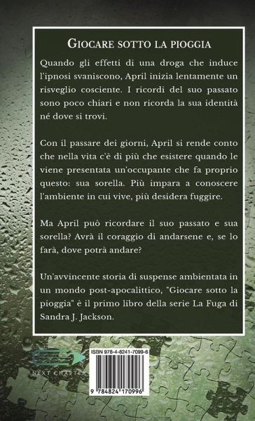 Quando gli effetti di una droga che induce l'ipnosi svaniscono, April inizia lentamente un risveglio cosciente. I ricordi del suo passato sono poco chiari e non ricorda la sua identità né dove si trovi. Con il passare dei giorni, April si rende conto che nella vita c'è di più che esistere quando le viene presentata un'occupante che fa proprio questo: sua sorella. Più impara a conoscere l'ambiente in cui vive, più desidera fuggire. Ma April può ricordare il suo passato e sua sorella? Avrà il coraggio di andarsene e, se lo farà, dove potrà andare? Un'avvincente storia di suspense ambientata in un mondo post-apocalittico, "Giocare sotto la pioggia" è il primo libro della serie La Fuga di Sandra J. Jackson.