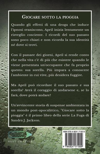 Quando gli effetti di una droga che induce l'ipnosi svaniscono, April inizia lentamente un risveglio cosciente. I ricordi del suo passato sono poco chiari e non ricorda la sua identità né dove si trovi. Con il passare dei giorni, April si rende conto che nella vita c'è di più che esistere quando le viene presentata un'occupante che fa proprio questo: sua sorella. Più impara a conoscere l'ambiente in cui vive, più desidera fuggire. Ma April può ricordare il suo passato e sua sorella? Avrà il coraggio di andarsene e, se lo farà, dove potrà andare? Un'avvincente storia di suspense ambientata in un mondo post-apocalittico, "Giocare sotto la pioggia" è il primo libro della serie La Fuga di Sandra J. Jackson.