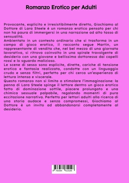Provocante, esplicito e irresistibilmente diretto, Giochiamo al Dottore di Lara Steele è un romanzo erotico pensato per chi non ha paura di immergersi in una narrazione ad alto tasso di sensualità. Ambientato in un contesto ordinario che si trasforma in un campo di gioco erotico, il racconto segue Martin, un rappresentante di vendita che, nel bel mezzo di una giornata lavorativa, si ritrova coinvolto in una spirale travolgente di desiderio con una giovane e bellissima dottoressa dai capelli rossi e lo sguardo malizioso. Le scene di sesso sono esplicite, dirette, cariche di tensione erotica e fantasia realizzata, condotte con un linguaggio crudo e senza filtri, perfetto per chi cerca un'esperienza di lettura intensa e viscerale. Questo romanzo non si limita a stimolare l'immaginazione: la penna di Lara Steele spinge il lettore dentro un gioco erotico fatto di dominazione sottile, piacere prolungato e una chimica sessuale palpabile, regalando momenti di pura eccitazione narrativa. Perfetto per lettori adulti alla ricerca di una storia audace e senza compromessi, Giochiamo al Dottore è un invito ad abbandonarsi completamente al desiderio.