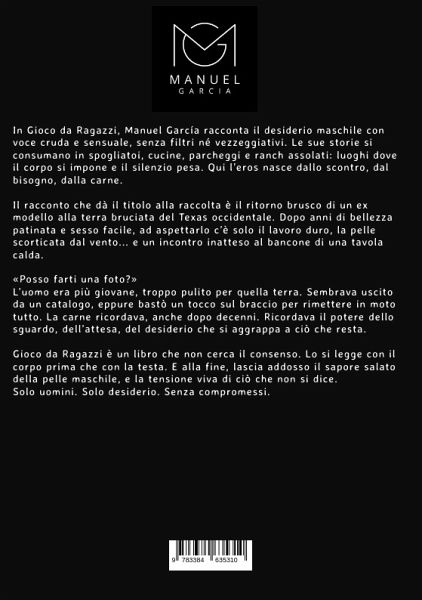In Gioco da Ragazzi, Manuel García racconta il desiderio maschile con voce cruda e sensuale, senza filtri né vezzeggiativi. Le sue storie si consumano in spogliatoi, cucine, parcheggi e ranch assolati: luoghi dove il corpo si impone e il silenzio pesa. Qui l'eros nasce dallo scontro, dal bisogno, dalla carne.Il racconto che dà il titolo alla raccolta è il ritorno brusco di un ex modello alla terra bruciata del Texas occidentale. Dopo anni di bellezza patinata e sesso facile, ad aspettarlo c'è solo il lavoro duro, la pelle scorticata dal vento... e un incontro inatteso al bancone di una tavola calda.«Posso farti una foto?»L'uomo era più giovane, troppo pulito per quella terra. Sembrava uscito da un catalogo, eppure bastò un tocco sul braccio per rimettere in moto tutto. La carne ricordava, anche dopo decenni. Ricordava il potere dello sguardo, dell'attesa, del desiderio che si aggrappa a ciò che resta.Gioco da Ragazzi è un libro che non cerca il consenso. Lo si legge con il corpo prima che con la testa. E alla fine, lascia addosso il sapore salato della pelle maschile, e la tensione viva di ciò che non si dice.Solo uomini. Solo desiderio. Senza compromessi.