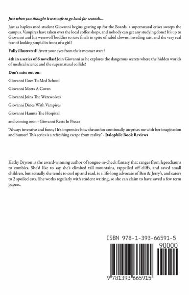 Just when you thought it was safe to go back for seconds… Just as hapless med student Giovanni begins gearing up for the Boards, a supernatural crises sweeps the campus. Vampires have taken over the local coffee shops, and nobody can get any studying done! It's up to Giovanni and his werewolf buddies to save finals in spite of rabid clowns, invading rats, and the very real fear of looking stupid in front of a girl! Fully illustrated! Avert your eyes from their mesmer stare! 4th in a series of 6 novellas! Join Giovanni as he explores the dangerous secrets where the hidden worlds of medical science and the supernatural collide! Don't miss out on: Giovanni Goes To Med School Giovanni Meets A Coven Giovanni Joins The Werewolves Giovanni Dines With Vampires Giovanni Haunts The Hospital and coming soon - Giovanni Rests In Pieces "Always inventive and funny! It's impressive how the author continually surprises me with her imagination and humor! This series is a refreshing escape from reality." - Italophile Book Reviews