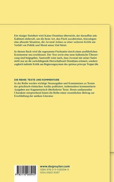 This work re-examines Juvenalâ??s big fish satire through detailed scholarly commentary. It includes the original text along with a new Italian translation. Santorelli demonstrates that Juvenal's satire not only looks back at the earlier period of Domitianâ??s rule but also is intended as an indirect critique of the political system of the Optimus Princeps Trajan.