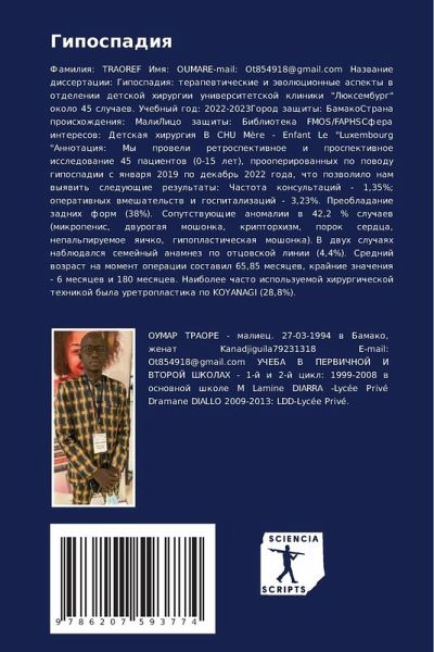 Familiq: TRAOREF Imq: OUMARE-mail: Ot854918@gmail.com Nazwanie dissertacii: Gipospadiq: terapewticheskie i äwolücionnye aspekty w otdelenii detskoj hirurgii uniwersitetskoj kliniki "Lüxemburg" okolo 45 sluchaew. Uchebnyj god: 2022-2023Gorod zaschity: BamakoStrana proishozhdeniq: MaliLico zaschity: Biblioteka FMOS/FAPHSSfera interesow: Detskaq hirurgiq V CHU Mère - Enfant Le "Luxembourg "Annotaciq: My proweli retrospektiwnoe i prospektiwnoe issledowanie 45 pacientow (0-15 let), prooperirowannyh po powodu gipospadii s qnwarq 2019 po dekabr' 2022 goda, chto pozwolilo nam wyqwit' sleduüschie rezul'taty: Chastota konsul'tacij - 1,35%; operatiwnyh wmeshatel'stw i gospitalizacij - 3,23%. Preobladanie zadnih form (38%). Soputstwuüschie anomalii w 42,2 % sluchaew (mikropenis, dwurogaq moshonka, kriptorhizm, porok serdca, nepal'piruemoe qichko, gipoplasticheskaq moshonka). V dwuh sluchaqh nablüdalsq semejnyj anamnez po otcowskoj linii (4,4%). Srednij wozrast na moment operacii sostawil 65,85 mesqcew, krajnie znacheniq - 6 mesqcew i 180 mesqcew. Naibolee chasto ispol'zuemoj hirurgicheskoj tehnikoj byla uretroplastika po KOYANAGI (28,8%).