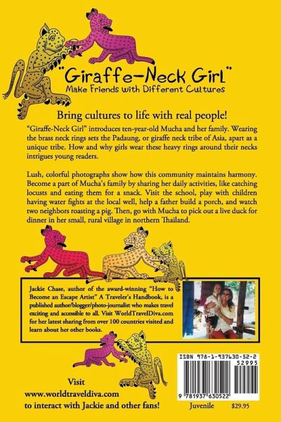 Bring cultures to life with real people! "Giraffe-Neck Girl" introduces ten-year-old Mucha and her family. Wearing the brass neck rings sets the Padaung, or giraffe neck tribe of Asia, apart as a unique tribe. How and why girls wear these heavy rings around their necks intrigues young readers. Lush, colorful photographs show how this community maintains harmony. Become a part of Mucha's family by sharing her daily activities, like catching locusts and eating them for a snack. Visit the school, play with children having water fights at the local well, help a father build a porch, and watch two neighbors roasting a pig. Then, go with Mucha to pick out a live duck for dinner in her small, rural village in northern Thailand. Jackie Chase, author of award-winning "Now to Become an Escape Artist" A Traveler's Handbook, is a published author/blogger/photo-journalist who makes travel exciting and accessible to all. Visit WorldTravelDiva.com for her latest sharing from over 100 countries visited and learn about her other books.