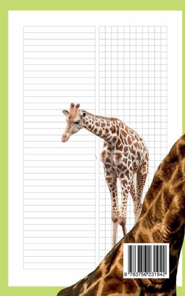 Giraffen fressen den ganzen Tag. Ein Notizbuch mit vielen Giraffen. Das Notizbuch mit Seiten die zur Hälfte liniert sind und zur anderen Hälfte kariert, jeweils 4mm. Das Büchlein ist mit Seitennummern versehen. Jede Seite enthält eine einzigartiges Foto einer oder mehrerer Giraffen. Das ist Natürlich ein muss für alle Giraffenfreunde. Die Fotos sind freundlich und amüsant und für alle Altersgruppen geeignet. Das Ganze ist ein schönes Buch zum Schenken und auch zum Selbstbehalten. Wir wünschen viel Freude damit.