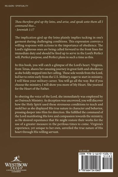 Thou therefore gird up thy loins, and arise, and speak unto them all I command thee... - Jeremiah 1:17 The implication gird up thy loins plainly implies tucking in one's garment during challenging conditions. This expression conveys a willing response with actions in the importance of obedience. The Lord's righteous ones are being called forward to the front lines for immediate duty and should be fired up to serve in the Lord's Perfect will, Perfect purpose, and Perfect plans in such a time as this. In this book, you will catch a glimpse of the Lord's heart. Virginia, from Texas, shares her amazing journey in great faith and obedience as she boldly stepped into her calling. These sole words from the Lord, led her to retire early from the U.S. Military, eager to start in ministry. I will bless your military career. You will go all the way. But if you choose the ministry, I will show you more of My Heart. She yearned for the Heart of the Father. In obeying the voice of the Lord, she immediately was employed by an Outreach Ministry. As deception was uncovered, you will discover how the Holy Spirit used these strenuous conditions to teach and mold her as she displayed His true nature in character and behavior, pressing deeper into Him for direction. She fulfilled the command of the Lord manifesting His love and compassion towards the ministry, as He desired repentance that He might restore their works for the use of a greater measure in the perilous times to come. Virginia's experience, yet unique to her own, unveiled the true nature of His heart through His willing servant.