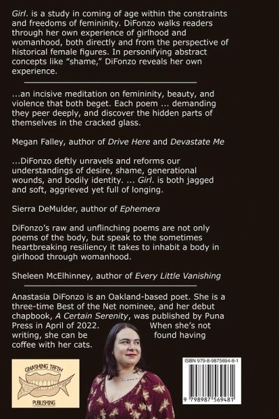 Girl. by Anastasia DiFonzo is a study in coming of age within the constraints and freedoms of femininity. DiFonzo walks readers through her own experience of girlhood, both directly and from the perspective of historical female figures. In personifying abstract concepts such as "shame," DiFonzo reveals her personal experience. However, Girl. does not only approach femininity from the context of the author's own story; rather, it invites that of her mother and late grandmother, coaxing out the result of generational and familial wounds on an individual under the oppressive force of feminine ideals. Beginning with the impact of her grandmother's expectations on the author's own sense of self and ending with the newfound bud of sexuality between girls, Girl. encapsulates what it means to be socialized female in a world that makes being a girl - and even a woman - a vulnerable and yet deeply soft and tender state. But no book is complete without having been able to hold multiple conflicting truths at once. At the very same time as the vulnerability, softness, and tenderness come through in Girl., so does a profound strength, and at times, even anger. How could we expect anything less? To be born a girl is to be born into a life of violence, be it physical, emotional, or both. We are told to hate ourselves, and at some point, it is only natural that such hatred be focused outward. In the end, though, the author creates her own peace as a woman and girl.
