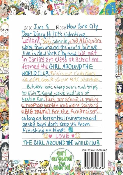 Moving to a new place can be daunting at any age, but when you're 10 years old and you move to a place as big as New York City... AND from all the way across the world, it can be downright unnerving! But nothing makes us feel more at home than making a new friend. So, when five forth-grade girls from around the world are lucky enough to meet in Carla's after-school art class, AND become besties, it seems totally obvi to form the most awesome club in the universe, aka the GIRL AROUND THE WORLD CLUB. To make it really official, when the lucky new club members find an empty diary in the art supply closet, Carla (the best art teacher ever) allows them to turn it into their official club diary. Leilani, a beach loving "Surfer Girl Supreme" is from Hawaii and sometimes feels like a fish out of water in the big city. Valentine is the artiste from France whose dreamy drawings and impeccable style reflect that of her painter/fashionista Maman. Juji is the fledgling wildlife vet from Kenya who misses her baby Bintu, the elephant she helped raise in Nairobi. Winnie is the tap dancing Australian math and science wiz who left her Dr. Dad back home in Sydney to be with her bigwig mom in NYC. And Alejandra is the gymnast from Peru who loves to cook and shares recipes and ancient Peruvian wisdom from her family's restaurant. When their school decides to build a rooftop garden to help the environment, Carla's students are on decoration duty for the fundraising event. It's decided that the Girl Around The World Club will paint a mural based on the national flower of their countries, and the boys will make garden gnomes from recycled plastic bottles. But when disaster strikes and a huge rainstorm ruins the mural, the boys and girls must find a way to overcome their pesky antics and preconceived ideas and find a way to work together to make a new one. Will they finish in time? When the school year ends the girls will have to separate and travel to their own countries for the summer holidays. But they notice empty pages in their diary that won't be filled because they'll be miles apart from one another (sniff, sniff). So to keep their club alive the girls decide to create interactive prompts, including intriguing questions and paper dolls, and invite their "Imaginary new club members" to participate and join the Club, because "Everyone is from somewhere and has their own story to tell." Day by day, in their own colorful words and pictures, 5 girls from around the world share their discovery of the strength that lies in diversity and that the power of unity, kindness, and a little hard work just might brighten the world... one rooftop garden at a time.