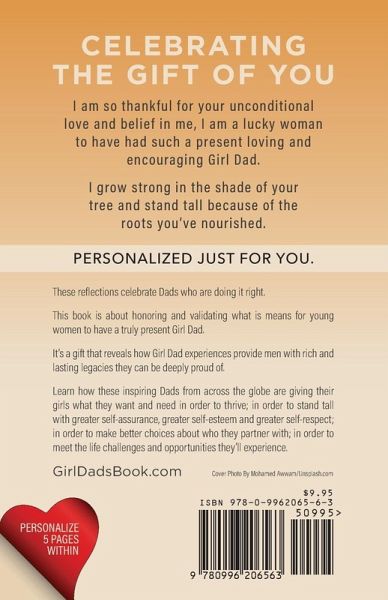 Celebrating the gift of you and your legacy of love, guidance and support as a Girl Dad. Personalize this inspiring gift book for the men you know who are raising daughters upright to thrive, stand tall with greater self-assurance, greater self-esteem and self-respect. Honor and validate them for helping to create women who will grow up to make better choices about who they partner with and how they will meet life's challenges and opportunities with strength, dignity and more ease. This gift reveals how Girl Dad experiences provide men with rich and lasting legacies they can be deeply proud of. This book is 27 pages of beautiful letters, art and a song specifically about being the "Best Daddy" written by award winning international song writer Cody Qualls. A delightful unique gift to give again and again as the year's go by with your reflections of what you love about the Girl Dads in your life.