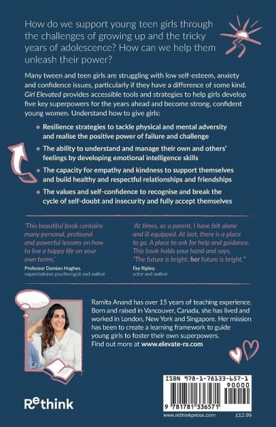 How do we support young teen girls through the challenges of growing up and the tricky years of adolescence? How can we help them unleash their power? Many tween and teen girls are struggling with low self-esteem, anxiety and confidence issues, particularly if they have a difference of some kind. Girl Elevated provides accessible tools and strategies to help girls develop five key superpowers for the years ahead and become strong, confident young women. Understand how to give girls:Resilience strategies to tackle physical and mental adversity and realise the positive power of failure and challenge The ability to understand and manage their own and others' feelings by developing emotional intelligence skills The capacity for empathy and kindness to support themselves and build healthy and respectful relationships and friendships The values and self-confidence to recognise and break the cycle of self-doubt and insecurity and fully accept themselves