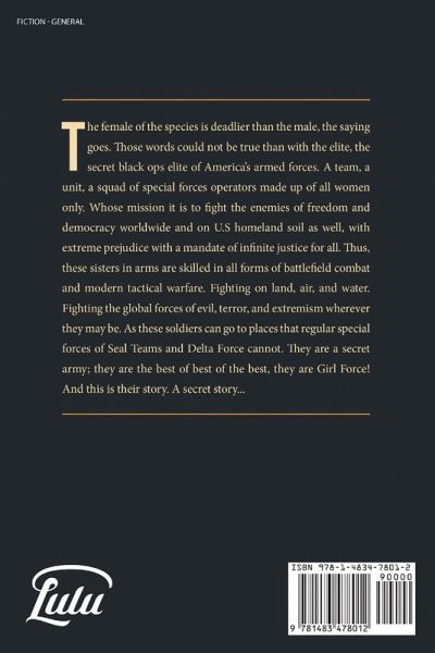The era of the woman is here! Lock and load! The female of the species is deadlier than the male, the saying goes. Those words could not be true than with the elite, the secret black ops elite of America's armed forces. A team, a unit, a squad of special forces operators made up of all women only. Whose mission it is to fight the enemies of freedom and democracy worldwide and on U.S homeland soil as well, with extreme prejudice with a mandate of infinite justice for all. Thus, these sisters in arms are skilled in all forms of battlefield combat and modern tactical warfare. Fighting on land, air, and water. Fighting the global forces of evil, terror, and extremism wherever they may be. As these soldiers can go to places that regular special forces of Seal Teams and Delta Force cannot. They are a secret army; they are the best of best of the best, they are Girl Force! And this is their story. A secret story...