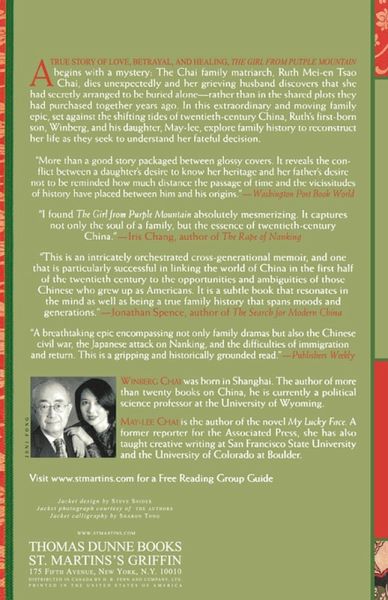 A family memoir set against the shifting tides of twentieth-century China, The Girl from Purple Mountain begins with a mystery: the Chai family matriarch, Ruth Mei-en Tsao Chai, dies unexpectedly and her grieving husband discovers that she had secretly arranged to be buried alone-rather than in the shared plots they had purchased together years ago. For many years, Ruth's family remained shocked by her decision and could not begin to fathom her motivations. Over time, they would fully understand her extraordinary story. Ruth was born in China at the beginning of the 20th century, during the reign of the last emperor. Educated by American missionaries, she was one of the first women admitted into a Chinese university, during an era when most Chinese women were illiterate and had bound feet. She would defy tradition and refuse to marry the man her family had chosen for her, instead choosing his younger brother as her husband. Later, as the Japanese Army advanced across China during World War II, her foresight and quick thinking kept her family alive as she, her husband, and their three sons were forced to flee from city to city. In war-torn Chungking, she was Lady Mountbatten's interpreter as the Allies struggled to help China. After the war, the Chais immigrated to the U.S. to what seemed, until Ruth's death, a happier and more peaceful life. In this extraordinary family epic, Ruth's first-born son, Winberg, and his daughter May-lee explore family history to reconstruct her life as they seek to understand her fateful decision. As Winberg writes: "It is my duty to try to understand my mother, to seek answers. To ignore the past is too much like forgetting . . . I hope my memories are enough to fulfill a son's obligations."
