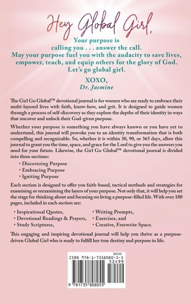 The Girl Go Global¿ devotional journal is for women who are ready to embrace their multi-layered lives with faith, know-how, and grit. It is designed to guide women through a process of self-discovery as they explore the depths of their identity in ways that uncover and unlock their God-given purpose. Whether your purpose is something you have always known or you have yet to understand it, this journal will provoke you to an identity transformation that is both compelling and recognizable. So, whether it's in 30, 90, or 365 days, allow this journal to grant you the time, space, and grace for the Lord to give you the answers you need for your future. Likewise, the Girl Go Global¿ devotional journal is divided into three sections: ¿ Discovering Purpose ¿ Embracing Purpose ¿ Igniting Purpose Each section is designed to offer you faith-based, tactical methods and strategies for examining or reexamining the layers of your purpose. Not only that, it will help you set the stage for thinking about and focusing on living a purpose-filled life. With over 180 pages, included in each section are: ¿ Inspirational Quotes, ¿ Devotional Readings & Prayers, ¿ Study Scriptures, ¿ Writing Prompts, ¿ Exercises, and ¿ Creative, Freewrite Space. This engaging and inspiring devotional journal will help you thrive as a purpose-driven Global Girl who is ready to fulfill her true destiny and purpose in life.