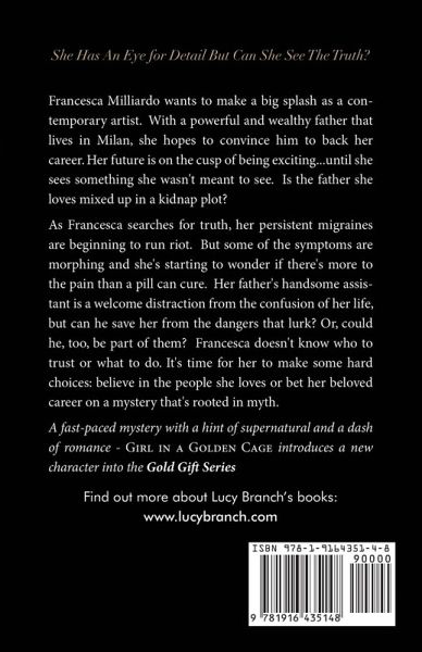 She has an eye for detail but can she see the truth? Francesca Milliardo sees something she wasn’t meant to see. Her dreams of making a big splash as a contemporary artist are on the line if she’s read the situation wrong. Worst still, her father seems to be involved. As Francesca searches for truth, her persistent migraines are beginning to run riot. Some of her symptoms are morphing and she's starting to wonder if there's more to the pain than a pill can cure. Her father's handsome assistant is a welcome distraction from the confusion of her life, but can he save her from the dangers that lurk? Or, could he, too, be part of them? Francesca doesn't know whom to trust or what to do. It's time for her to make some hard choices: believe in the people she loves or bet her beloved career on a mystery that's rooted in myth. 'A fast-paced mystery with a hint of supernatural and a dash of romance - Girl in A Golden Cage is a standalone story that introduces a new character into the Gold Gift Series.' 'A dark story full of intrigue, conspiracy theory and art. For fans of Dan Brown, Andy McDermott and Kate Mosse.'