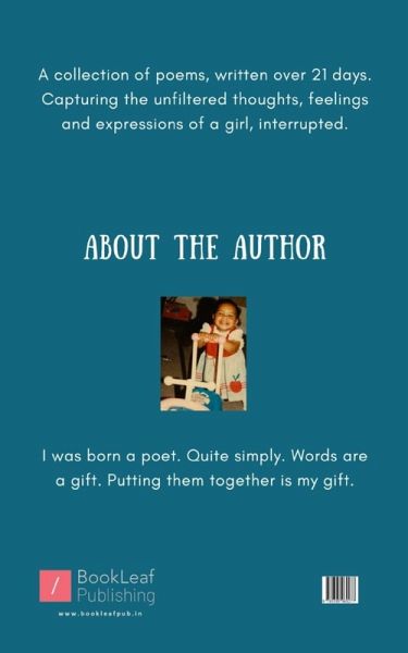A collection of poems, written over 21 days. Capturing the unfiltered thoughts, feelings and expressions of a girl, interrupted.