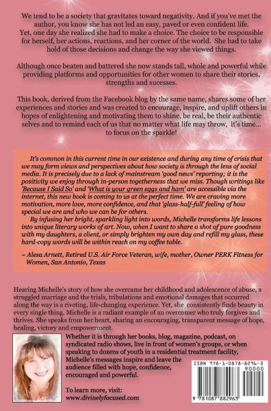 Simply speaking, we are a society that gravitates toward negativity. Even before I was the owner of Focus on Fabulous magazine (www.fofmagazine.com) and Podcast, I have been a positive person. If you know mi, you know I have not led an easy, paved or even confident life and yet here I am. Standing. Beaten and battered but whole and powerful. But no, I have not always been that way. I had to make a choice. The choice to be responsible for myself, my actions, reactions, and my corner of the world. I had to take hold of the decisions I made and to change the way I viewed things. This book is derived from the Facebook blog by the same name. It was created to share some of my experiences and stories in hopes of enlightening and encouraging you to shine, be real, be authentically you and to remind you that no matter what life throws you, Girl, it's time.. to focus on the sparkle!