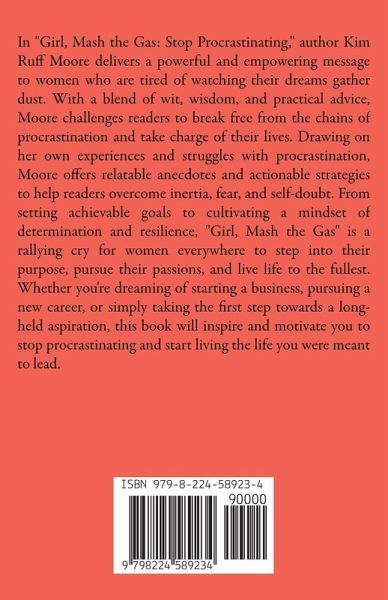 In "Girl, Mash the Gas: Stop Procrastinating," author Kim Ruff Moore delivers a powerful and empowering message to women who are tired of watching their dreams gather dust. With a blend of wit, wisdom, and practical advice, Moore challenges readers to break free from the chains of procrastination and take charge of their lives. Drawing on her own experiences and struggles with procrastination, Moore offers relatable anecdotes and actionable strategies to help readers overcome inertia, fear, and self-doubt. From setting achievable goals to cultivating a mindset of determination and resilience, "Girl, Mash the Gas" is a rallying cry for women everywhere to step into their purpose, pursue their passions, and live life to the fullest. Whether you're dreaming of starting a business, pursuing a new career, or simply taking the first step towards a long-held aspiration, this book will inspire and motivate you to stop procrastinating and start living the life you were meant to lead.