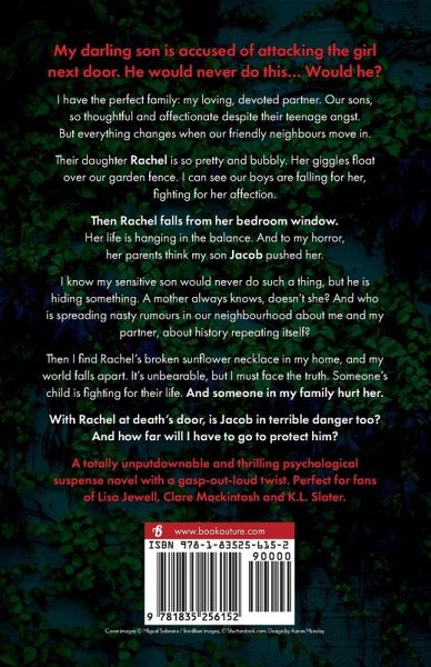 My darling son is accused of attacking the girl next door. He would never do this... Would he? I have the perfect family: my loving, devoted partner. Our sons, so thoughtful and affectionate despite their teenage angst. But everything changes when our friendly neighbours move in. Their daughter Rachel is so pretty and bubbly. Her giggles float over our garden fence. I can see our boys are falling for her, fighting for her affection. Then Rachel falls from her bedroom window. Her life is hanging in the balance. And to my horror, her parents think my son Jacob pushed her. I know my sensitive son would never do such a thing, but he is hiding something. A mother always knows, doesn't she? And who is spreading nasty rumours in our neighbourhood about me and my partner, about history repeating itself? Then I find Rachel's broken sunflower necklace in my home, and my world falls apart. It's unbearable, but I must face the truth. Someone's child is fighting for their life. And someone in my family hurt her. With Rachel at death's door, is Jacob in terrible danger too? And how far will I have to go to protect him? A totally unputdownable and thrilling psychological suspense novel with a gasp-out-loud twist. Perfect for fans of Lisa Jewell, Clare Mackintosh and K.L. Slater. What readers are saying about Girl Next Door: 'Extraordinary... Had me on the edge of my seat! There were so many secrets, so many twists and turns that I couldn't put it down! Excellent read!! 5 stars!' NetGalley reviewer, ¿¿¿¿¿ 'WOW! I was hooked from the very beginning. I was OMG the entire time and read in one sitting! If you're questioning reading this book, just do it!!!!' NetGalley reviewer, ¿¿¿¿¿